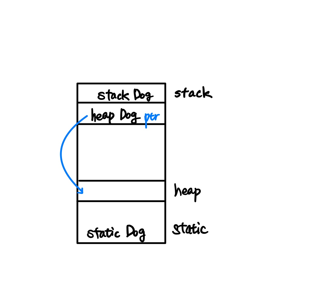 위 코드 main함수를 보게 되면 Dog stackDog가 있다. 해당 객체는 stack영역에 저장이 된다. 다음은 Dog* heapDog는 포인터이다. stack영역에 포인터를 생성하고 heap영역에 객체를 생성한 뒤 포인터가 heap영역의 객체를 가리키는 식으로 메모리가 할당이 된다. 마지막으로 Dog staticDog는 static메모리 공간에 할당이 된다.