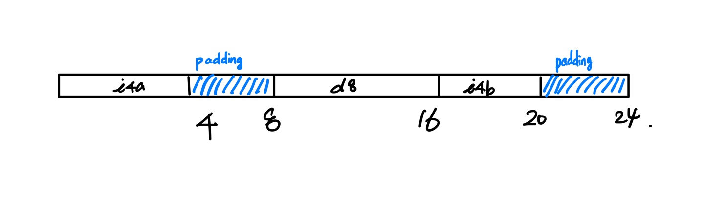 이번에는 double형 d8을 int형 멤버 변수 사이에 위치하였다. 해당 케이스도 main함수에서 sizeof() 연산자를 통해 크기를 출력해본 결과 24바이트로 출력이 됐다. 왜 그런 걸까?