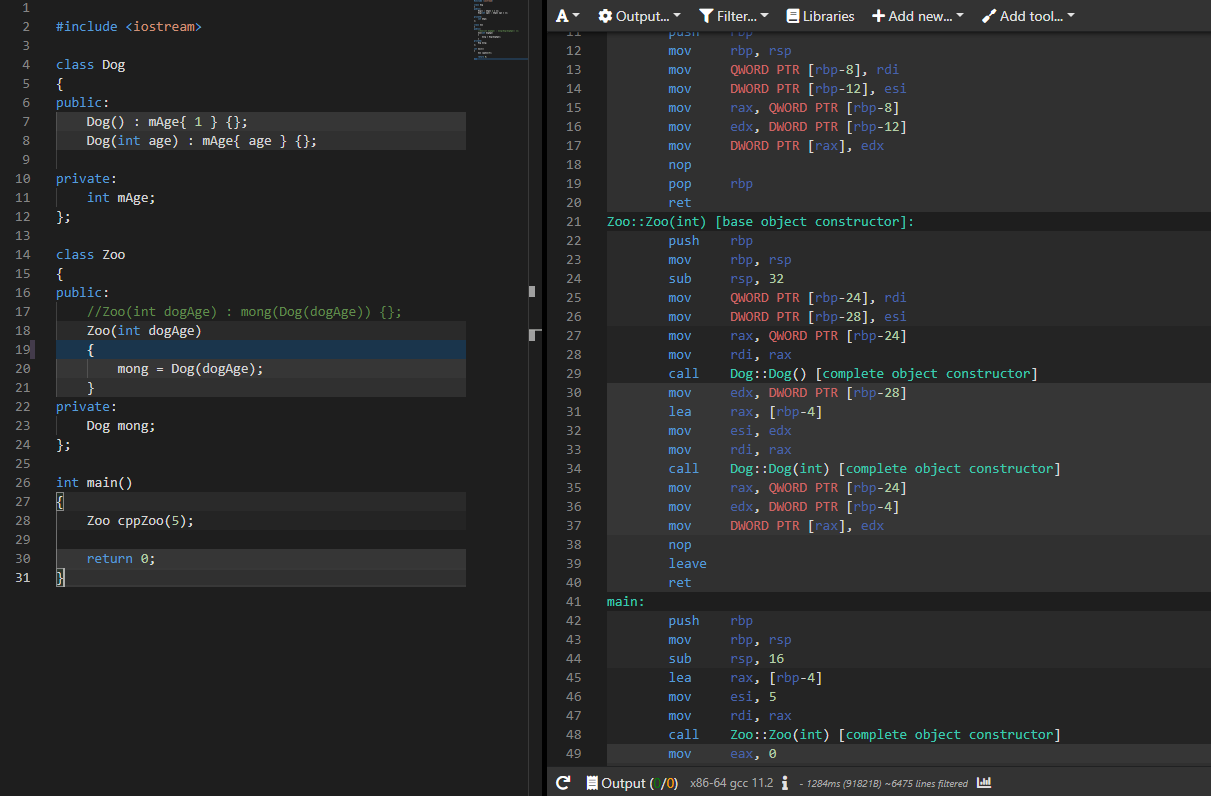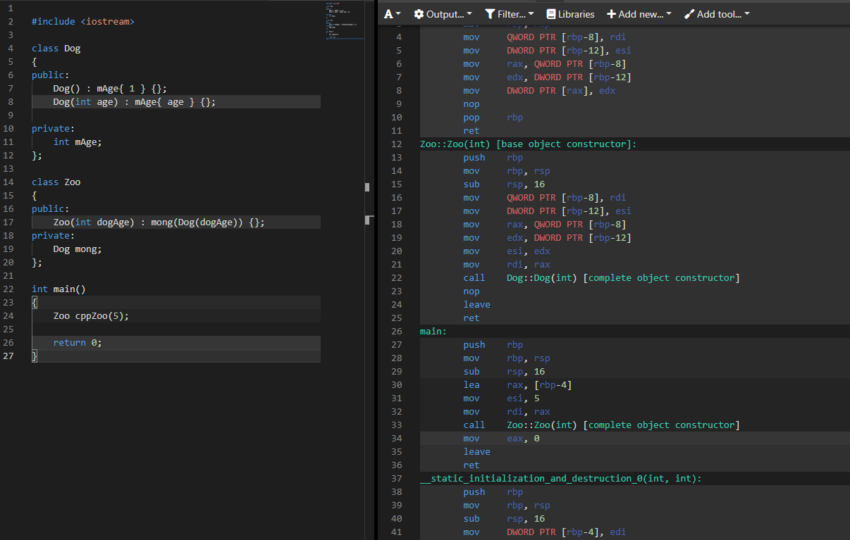 똑같이 우측 어셈블리 코드를 보면 Zoo::Zoo(int)에서 Dog::Dog(int) 생성자가 한번 호출이 되고 그다음 mov키워드가 없는 것을 확인할 수 있다. 이러한 이유 때문에 메모리 관점에서 효율적인 코드를 짜기 위해서 Member initializer list를 사용하는 것이다.